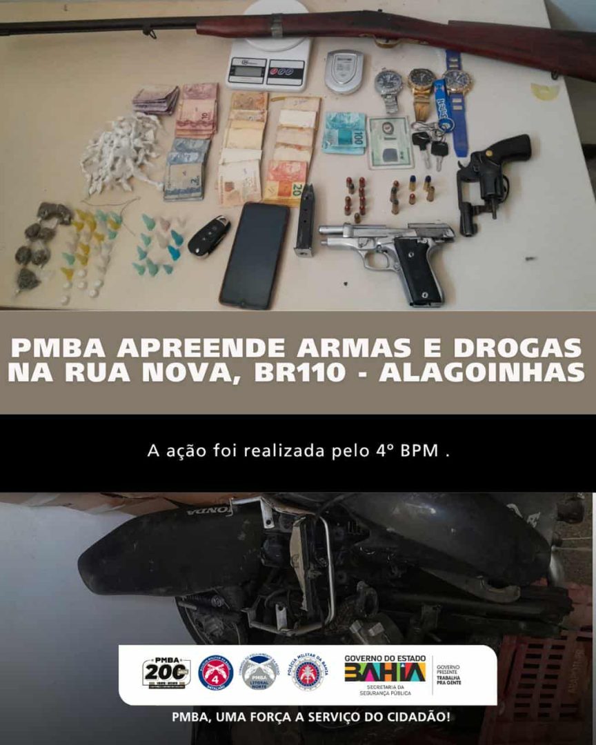 Policiais Militares da 4ª CIA do 4º BPM e da Companhia Independente de Policiamento Especializado (CIPE) Litoral Norte, apreenderam duas armas de fogo, drogas e munições, na manhã de sexta-feira, 10 de outubro, na cidade de Alagoinhas (BA).