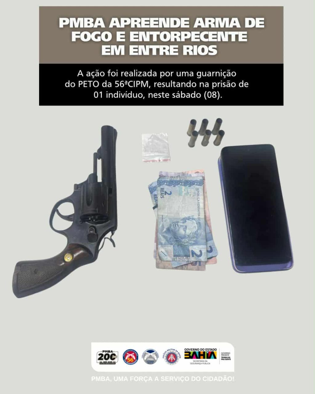Policiais Militares do Pelotão de Emprego Tático e Operacional (PETO) da 56ª CIPM, apreenderam uma arma de fogo, na noite de sábado, 8 de novembro, na cidade de Entre Rios (BA).