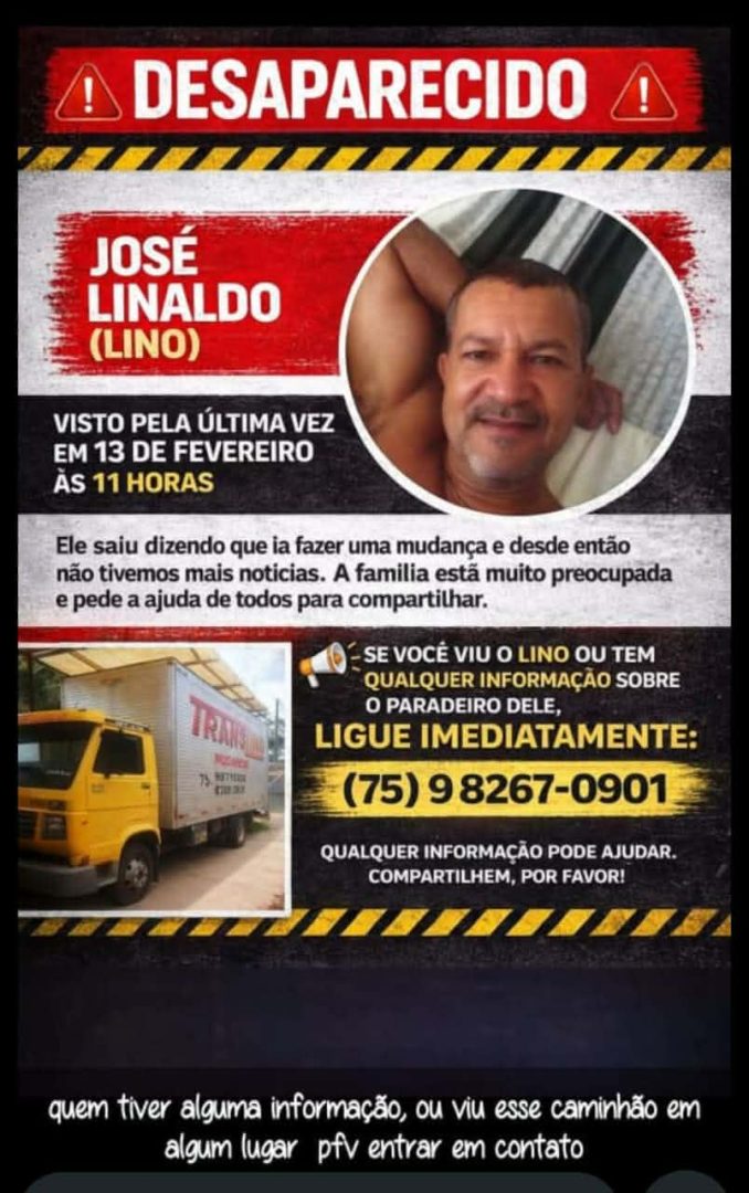 José Linaldo saiu para realizar um carreto do bairro Miguel Velho em Alagoinhas, para o município de Pedrão, em um caminhão com cabine amarela e o baú com identificação da Translino e não deu mais notícias.