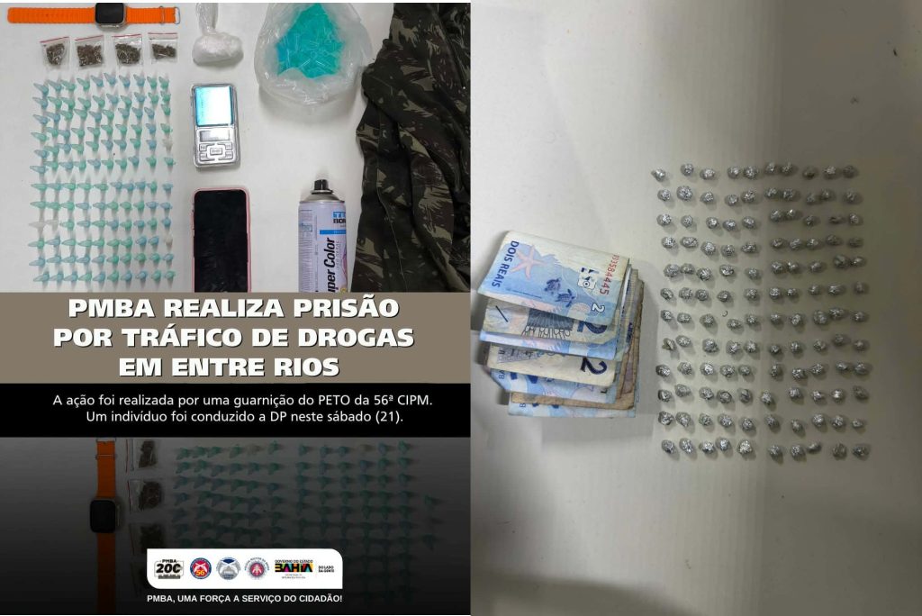 Policiais da 56ª companhia Independente de Polícia Militar (CIPM), apreenderam maconha, cocaína, crack, em Entre Rios, cidade localizada a 47 km do polo regional, Alagoinhas e pertencente ao Território de Identidade do Litoral Norte e Agreste Baiano.