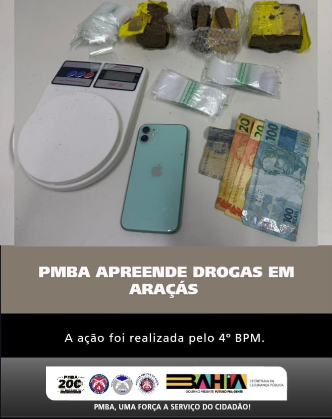 Na madrugada de terça-feira, 24 de fevereiro, militares do 4º BPM, prenderam um homem com drogas, no Centro de Araçás, município localizado a 28 km de Alagoinhas, cidade considerada capital do Território de Identidade do Litoral Norte e Agreste Baiano.