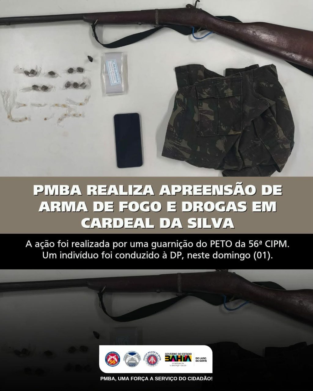 Na noite de domingo, 1º de março, a Polícia Militar da Bahia (PMBA), por meio de uma guarnição do PETO da 56ª CIPM, realizou a apreensão de arma de fogo e drogas no bairro Nova Pastora, em Cardeal da Silva, município do Território do Litoral Norte e Agreste Baiano e localizado a 64 km de Alagoinhas.