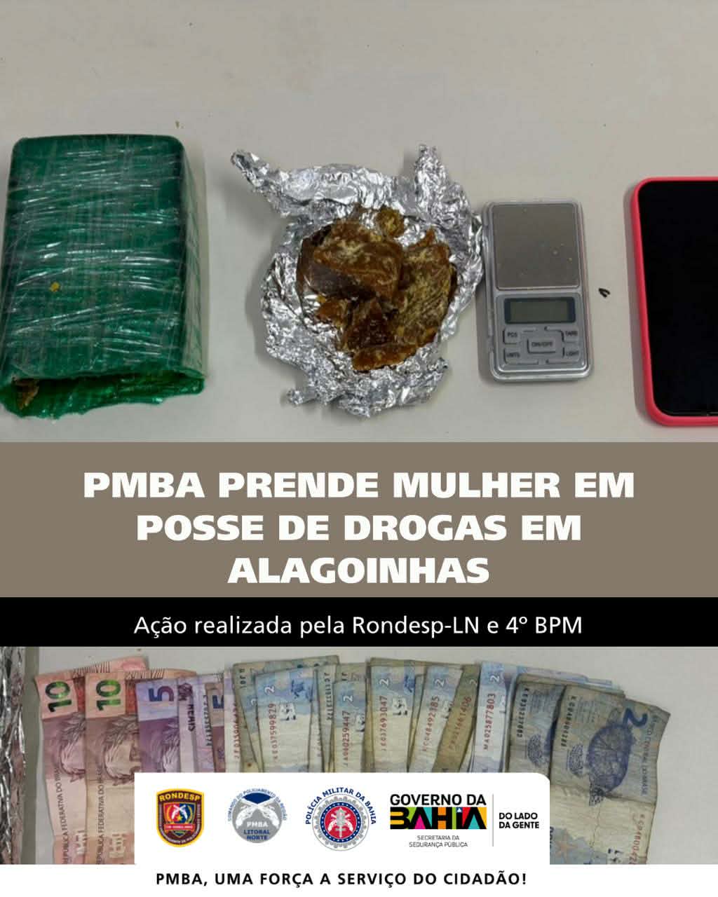 Policiais Militares da Rondesp Litoral Norte e da Companhia de Emprego Tático e Operacional (CETO), do 4º Batalhão de Polícia Militar (BPM), apreenderam drogas e detiveram uma mulher suspeita de tráfico, no início da tarde de sexta-feira, 13 de março, no bairro Praça Kennedy, na cidade de Alagoinhas (BA).