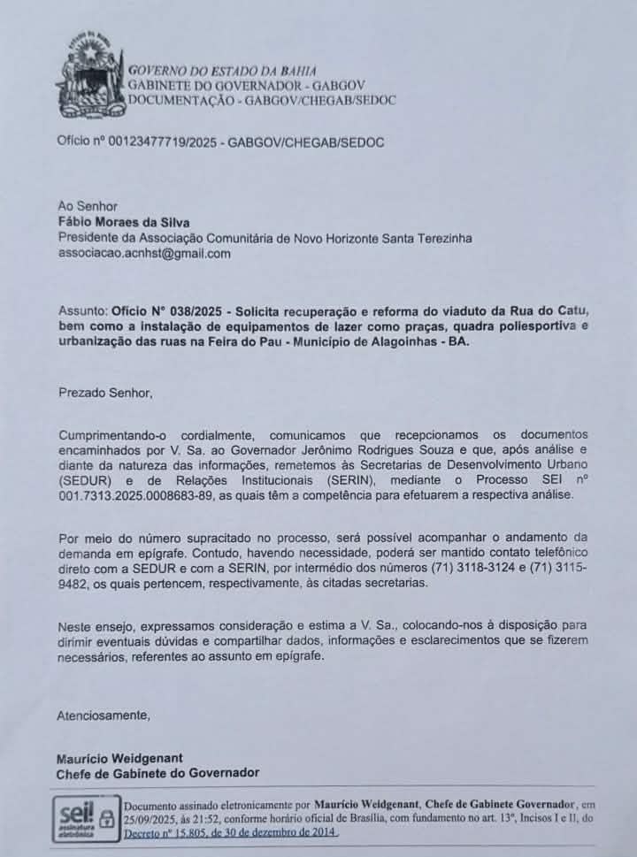 O documento foi assinado eletronicamente pelo chefe de gabinete do governador da Bahia, Maurício Weidgenant, na noite de 25 de setembro de 2025.