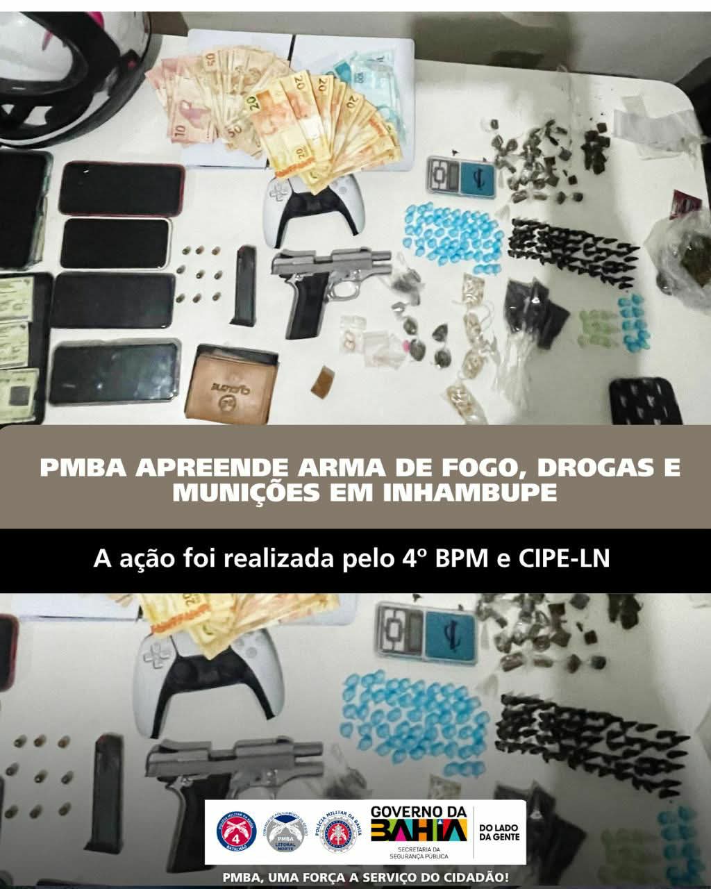 Com o suspeito, foram apreendidos quatro (04) celulares, um (01) Iphone, um (01) tablete, uma (01) pistola calibre 380, um (01) carregador com nove munições, R$ 1.010, um (01) playstation 5, uma (01) moto CG azul sem restrição, um (01) capacete, uma (01) balança de precisão, 183 microtubos tipo Eppendorf com cocaína, 38 trouxas pequenas com maconha, um (01) pacote contendo 74 gramas de maconha, 104 pacotes de crack, quatro (04) comprimidos de ecstasy e uma pedra grande pesando aproximadamente 12 gramas de crack.